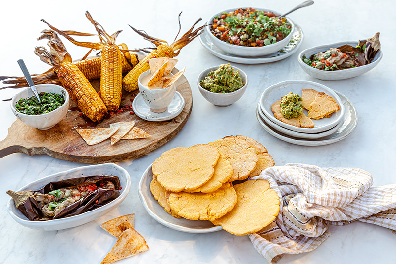 Käsedip, Kräutersalsa, Guacamole & Salat aus schwarzen Bohnen