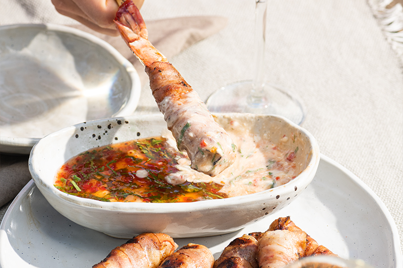 - Die in Speck gewickelten Gambas mit dem Knoblauchöl bestreichen. Die Spiesse auf den Satay-Grill aus Gusseisen legen, den Deckel des EGG schliessen und die Spiesse ca. 3 Minuten lang grillieren.