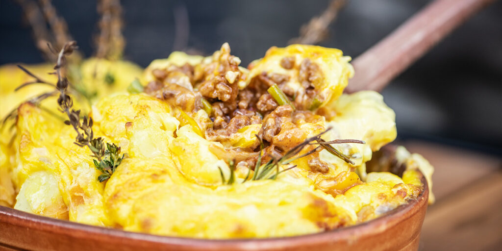chon mal vom englischen Shepherd’s Pie gehört? Das Originalrezept besteht aus einer Schicht Lammhack mit einer Schicht Kartoffelpüree darüber. Ein perfektes Rezept für den Keramikgrill. Wir haben die Hackfleischfüllung noch mit Gemüse verfeinert und den Auflauf mit grob zerteilten Kartoffeln und einer speziellen Sauce mit Cheddar überbacken. Das ultimative Pubfood aus dem Big Green Egg!